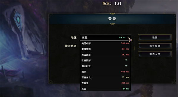 1.登錄游戲時,我們會被詢問地區和語言。我們可以在下拉框中進行更改。