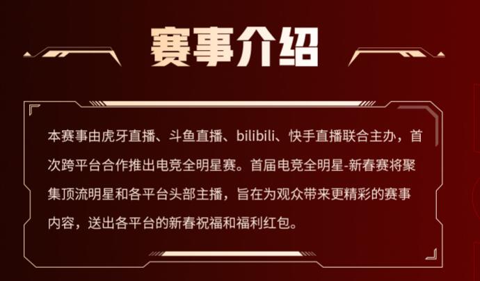 3、首屆電競全明星新年賽將云集各平臺頂級明星、頂級主播,旨在為觀眾帶來更多精彩的賽事內容,并送出各平臺的新年祝福和福利紅包。