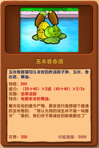 香蒲玉米餅可以發(fā)射四發(fā)追蹤子彈,玉米,白菜,黃油。