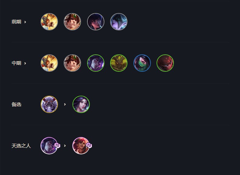 這個陣容前期可以盡量使用三國重裝或者是重裝射手來過渡。重猴或者三國蓋倫都是不錯的選擇。如果能打到錘石的天選重裝就更好了。狐貍還沒有來之前千玨,阿卡麗和豹女這些都可以穿著狐貍的裝備打工。