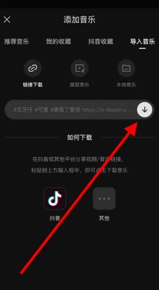 3.復(fù)制這里抖音視頻音樂的鏈接,然后點(diǎn)擊輸入框右側(cè)的下載圖標(biāo)進(jìn)行下載,最后點(diǎn)擊使用即可在您的視頻中使用。
