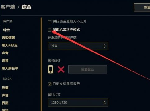 2、選擇綜合界面找到低配機適配模式并勾選。